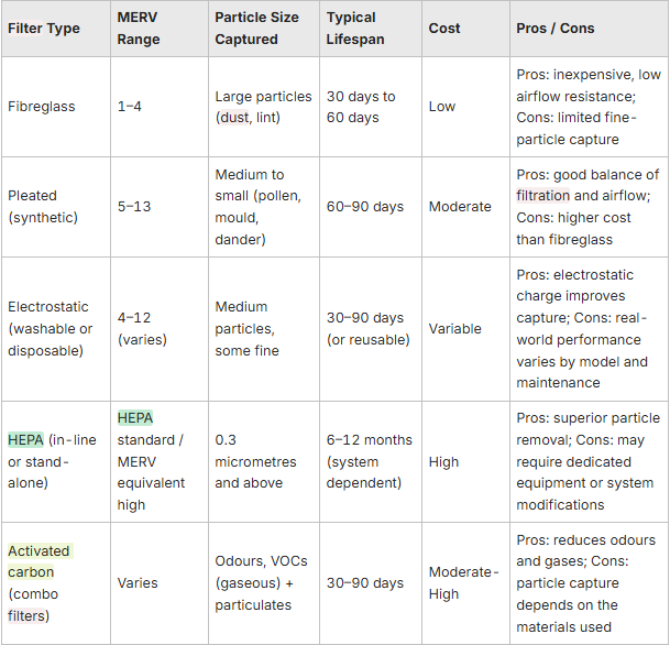 Common choices for homes include fibreglass, pleated, electrostatic, HEPA (either in-line or standalone), and activated carbon or combo filters. Each one uses different materials and construction to catch particles.