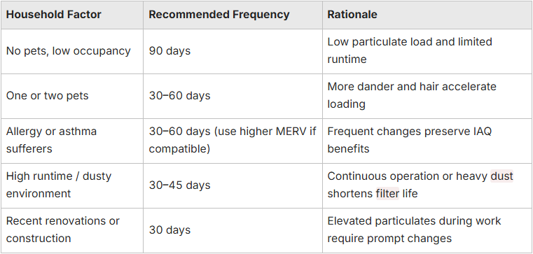 These factors interact with the filter material. For example, a home with two pets using a pleated MERV 8 filter might need to change it every 30 to 60 days. The table below matches common household situations with recommended frequencies and explains why they matter.