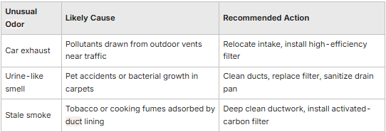 Below is an overview of uncommon odors, their likely origins, and targeted actions: