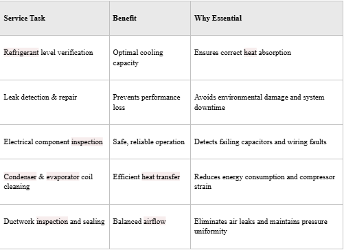 Refrigerant level checks and leak detection confirm the correct cooling agent volume, which is important for consistent heat exchange and peak system performance under summer heat.